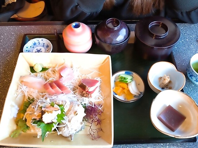今回頼んだのはミックスフライ膳2400円と、妻が煮魚(金目鯛の煮付)と刺身のセットになった春膳2600円。