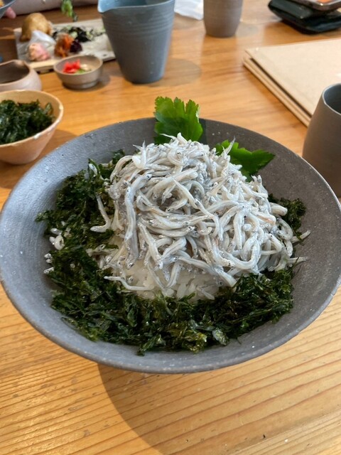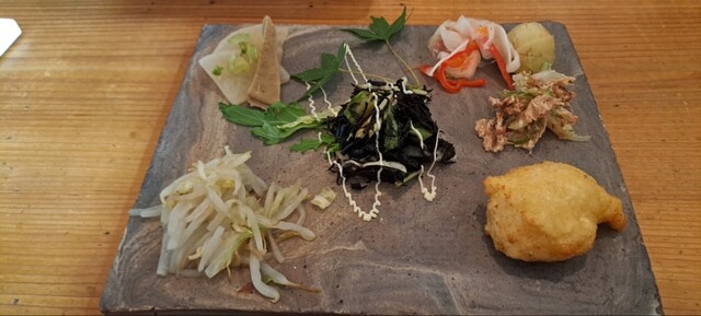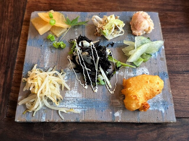 まだ昼前とあって、落ち着きのある店内は空いている。“前菜プレート”と“お茶&お菓子”の付いた「伊豆わさび麦とろ丼」1,760円をオーダーすると、10分弱でまず前菜7品が着皿した。ひじきのレモ...