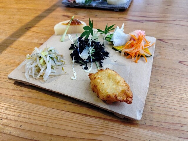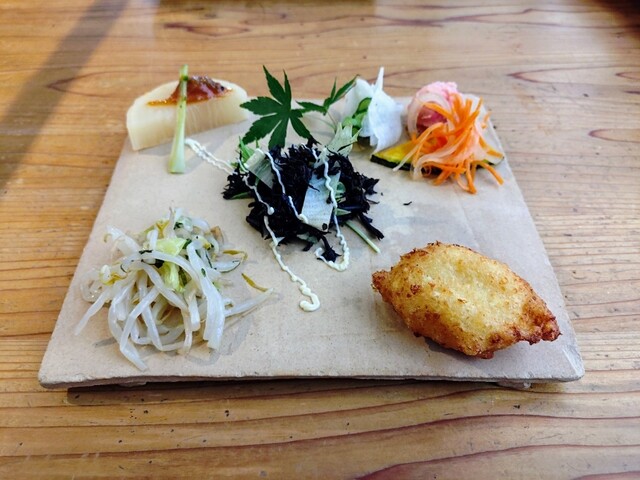 ◇まず『前菜5種』ですが、この日は、『豆腐ナゲット』や『ビーツを使ったポテトサラダ』『大根のふき味噌』など、どれも手の込んだおばんざいで、そして全てうまい✨