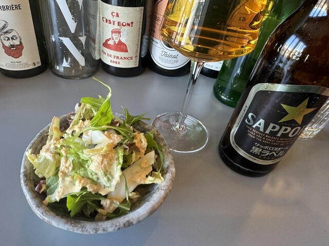 まずはサラダとビール。濃いめのドレッシングが美味しい。