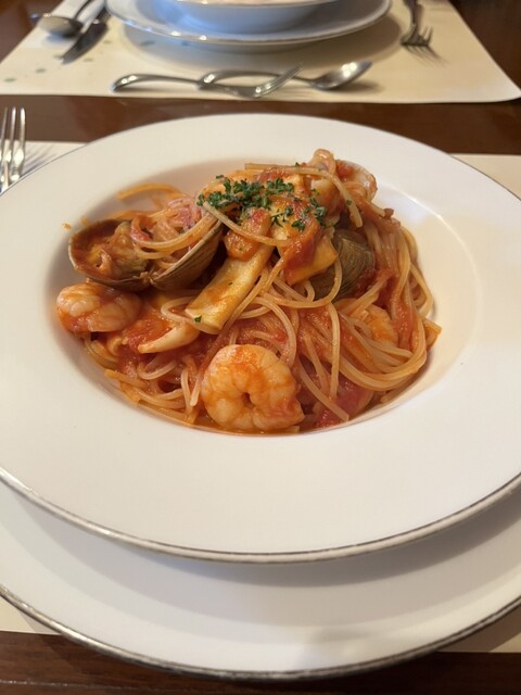 連れは、魚介類のトマト...