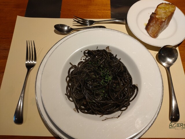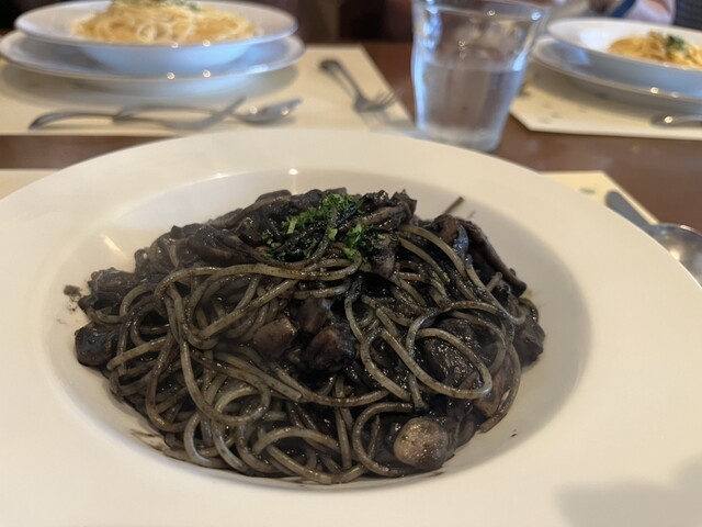 パスタランチ2450円でイカ墨スパゲティを注文(+100円で飲み物をカプチーノに)。