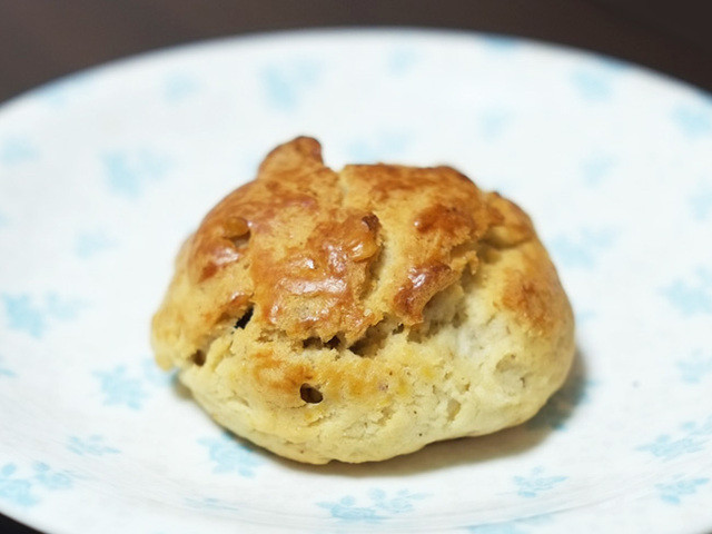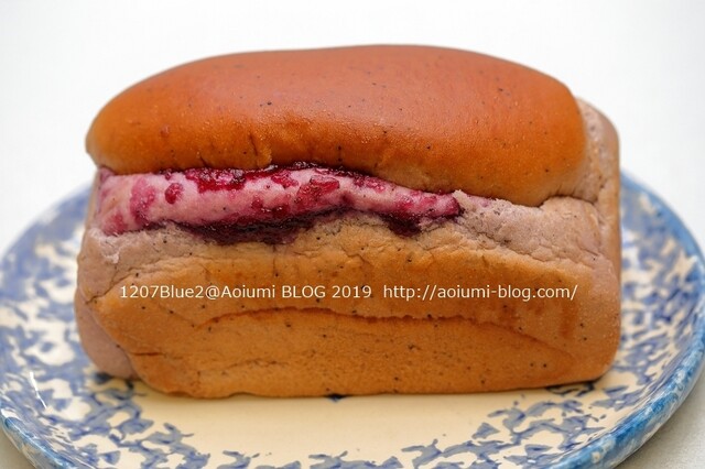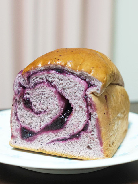シロップ漬けされたブルーベリーとブルーベリージャムをたっぷりと練り込んだもちもちパン。甘くてもちもち好きな方にはオススメかな。