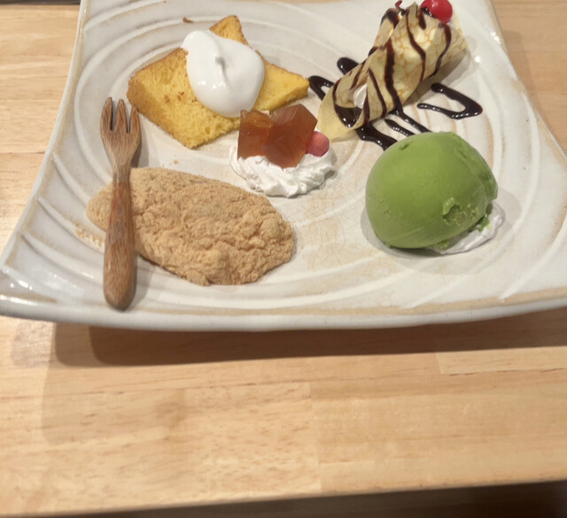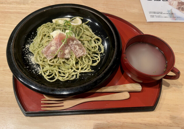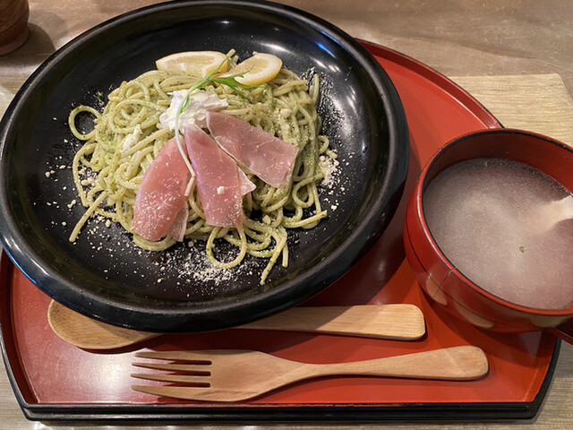 落ち着いて洒落た和カフェ。お得なランチメニューは12種で洋風が多く茶蕎麦等の和風メニューもある。バーコードを読み込んでスマホからのオーダーとなる。注文したのは"ジェノベーゼランチパスタ"で、前菜3種とデザート5点盛り、ドリンクが含まれ大変お得なセットとなっている。味わいは一押しする迫力には欠けるものの、上品さある優しい味わいが良い。特にデザート5点盛りはパンケーキの柔らかさと鎌倉わらび餅のプルプル...
