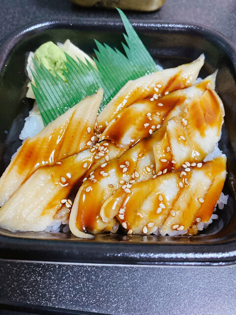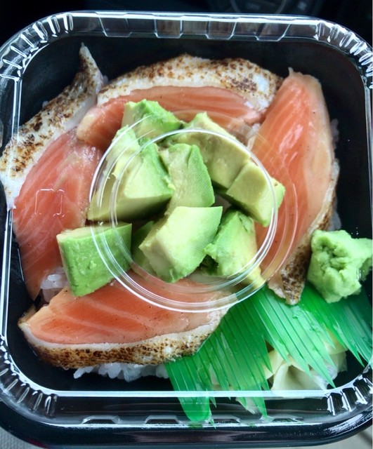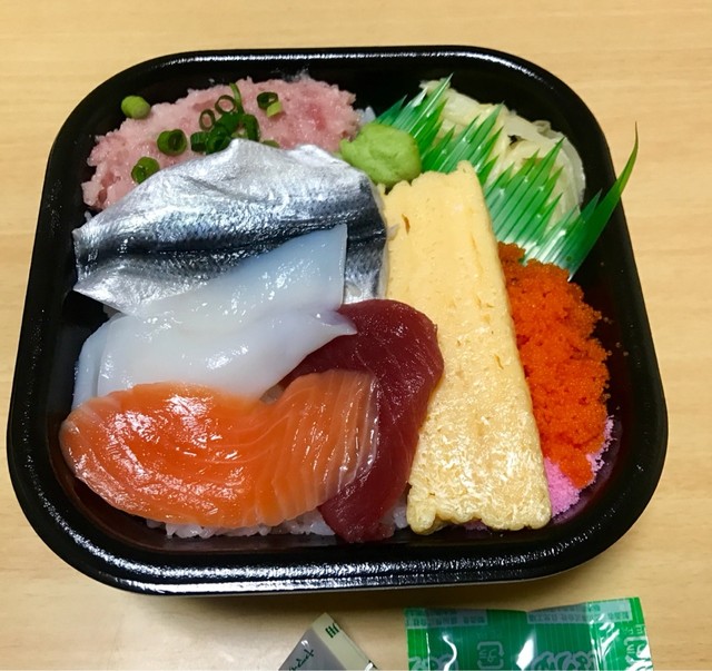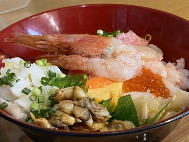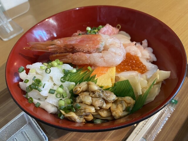テイクアウト専門ではあるものの当店では店内飲食も可能で、4人掛けテーブル1と1人用テーブル1がある。海鮮丼のメニューはとても豊富で数えると60種類程。価格はテイクアウト向けとしてかなりリーズナブルに感じられる。今回は店の看板メニュー"大漁丼"をイートインで頂くことにし、追加トッピングとして"浅利とエンガワ"を追加してもらうことにした。大漁丼はその日のお任せ鮮魚10種がのったお得感のある海鮮丼。ネタ...