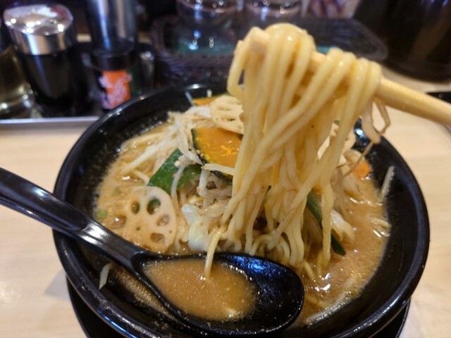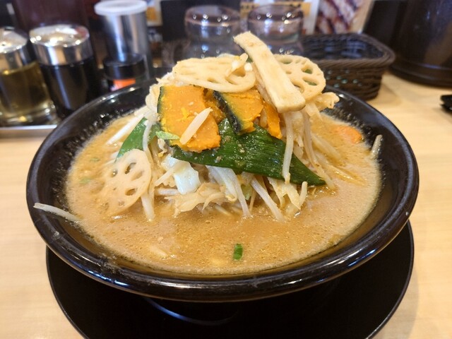 具は野菜だけといさぎよく カボチャ、蓮根、ネギ、モヤシ、ごぼう、白菜が入っており 麺大盛りにしたせいか盛り上がって見えます◯ 蓮根とごぼうが意外性があって◯ カボチャが多くてスープに溶けると甘味が増えて旨味が増します◎