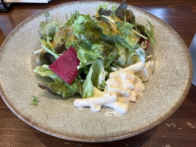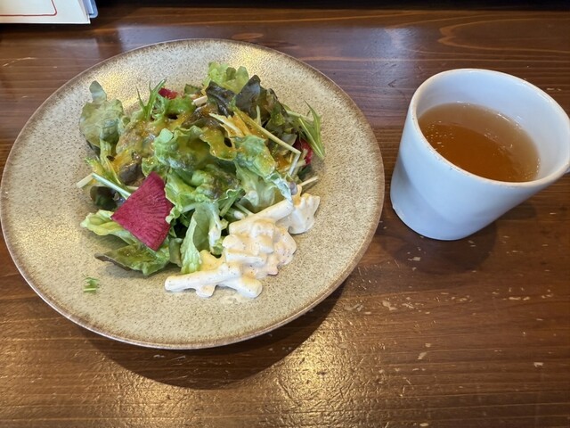 提供は、10分程でシャキシャキのサラダとコンソメスープが登場です