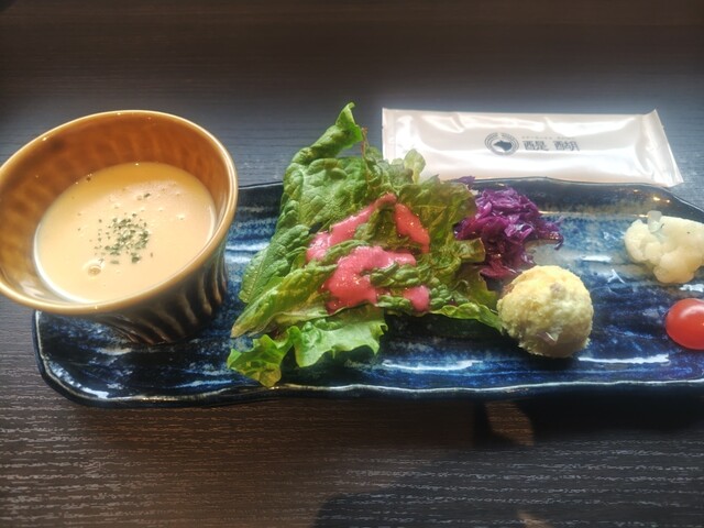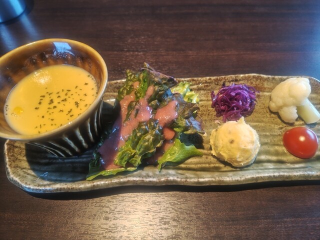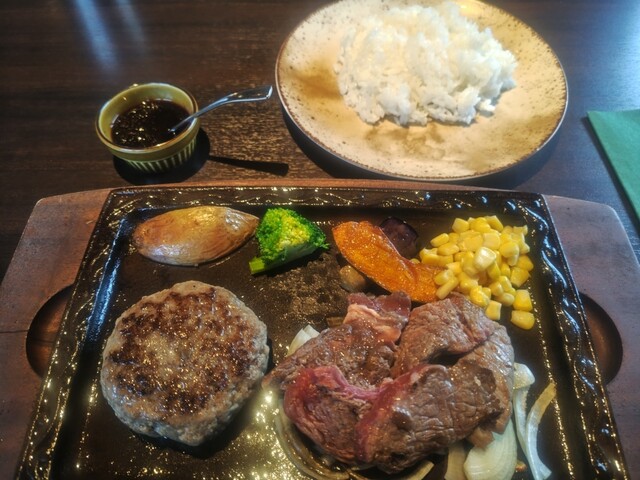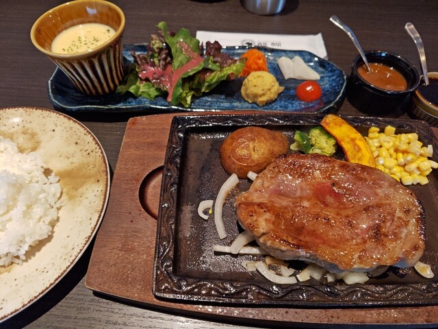 久しぶりの訪問。ランチ時間帯を外し平日の13:15くらいに行ったので他のお客さんは無く、静かにゆったりとランチを楽しみました。注文したのは「ハンバーグ&カットステーキ」2390円です。意識していませんでしたが写真のようなお洒落な前菜が付いて来ました。普段は好んでは食べないカリフラワーが柔らかく美味しく味付けがされていたのは印象強かったです。メインのハンバーグとカットステーキは可もなく不可もなくでした。タレにさっぱり系が良いと考えおろしポン酢にしましたが濃い味でした。次回はガーリックのタレにします。最近、太り気味だからおかわりは控えましたがお米が高い昨今、ライスおかわり自由はかなり魅力的だと思います。更にライス提起時にライスのブランド名も言ってくれます。山形産のお米でした。すいませんがブランド名は忘れてしまいました。