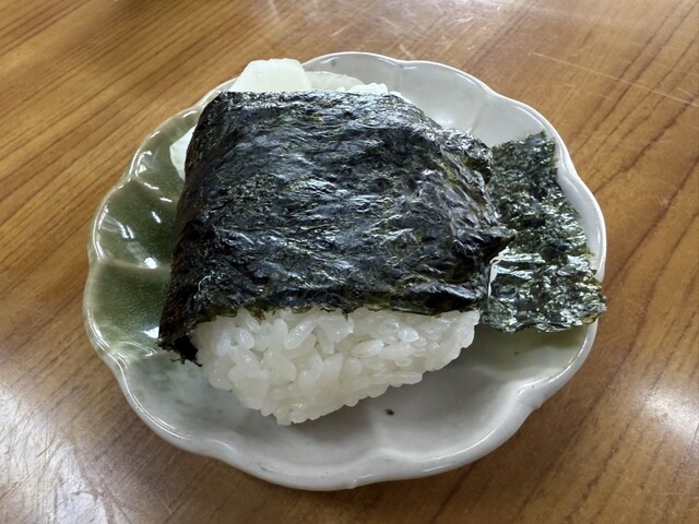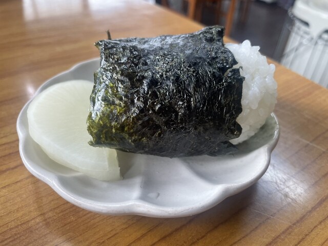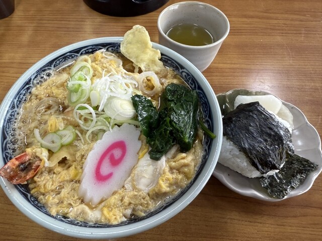 表向きは街道沿いの昔ながらの食堂といった佇まいで、店内も小ぢんまりとして4人掛けテーブルが4卓程。メニューは蕎麦を中心にうどん、天ぷら、丼もの等と蕎麦店の標準的メニュー数である。気候が肌寒い日とあって、今回は温かいものとして"天とじ蕎麦"1,000円を注文することにした。先ず驚かされたのは注文前におにぎりがお通しとして配膳されたこと。ご当地ならではのサービスの良さが感じられる。メインの天とじ蕎麦は...