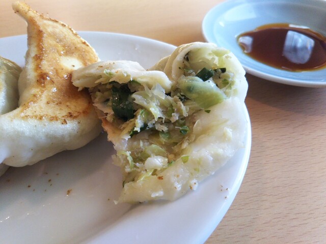 かぶりつくと包み方が弱いのか、パカッと開いてしまい食べづらい。皮はもっちり。ニンニクの効いた具がたくさん入っていますが、野菜ばかりでほとんど肉感はありません。よって肉汁もなし。っていうか肉は使ってないのかな? 野菜餃子ですねー。一回食べたらもういいかなぁ。