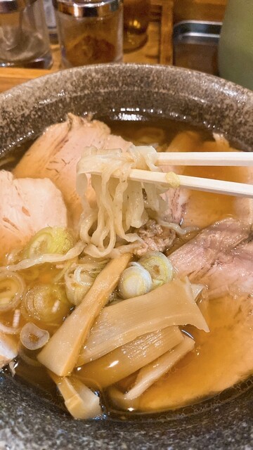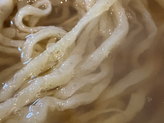 麺には全粒粉をブレンドした粗挽きの小麦粉を使用。青竹で打つ自家製麺はモチモチの歯ごたえが魅力で澄んだスープと良く合います。