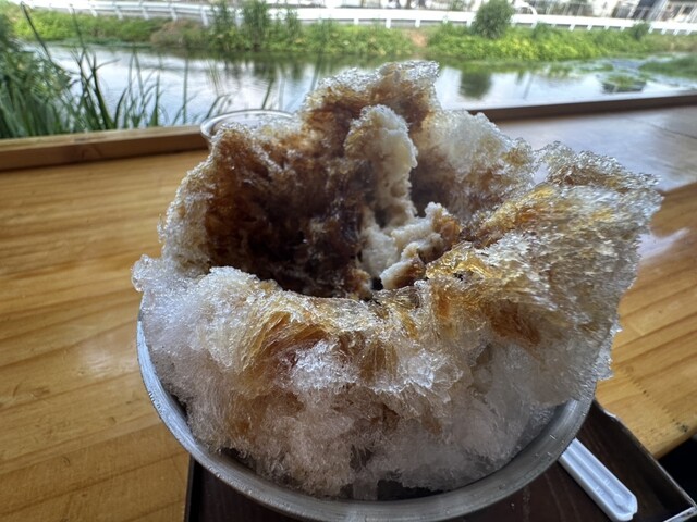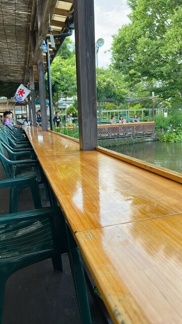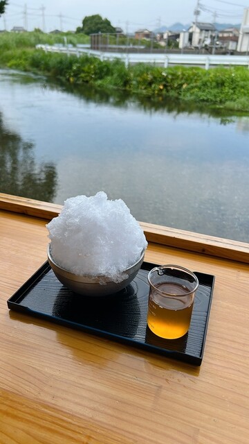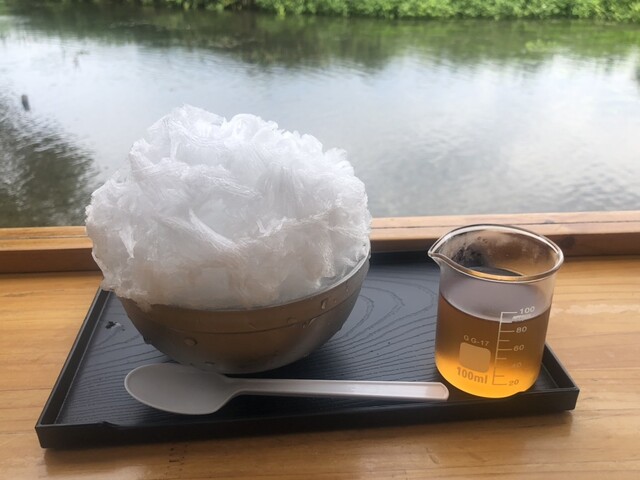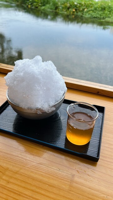 食べログで写真を見てみると、なんと川のほとりでかき氷を食べている人たちの...