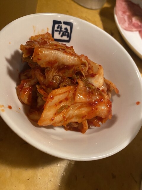 今回も食べ放題コースを注文しました。牛タン、カルビ、ハラミなどなど、たくさん注文しました。お供のライス(大)+冷麺も忘れずに。どれもおいしかったです。写真は、甘党のわたしでも食べられる牛角キムチ。