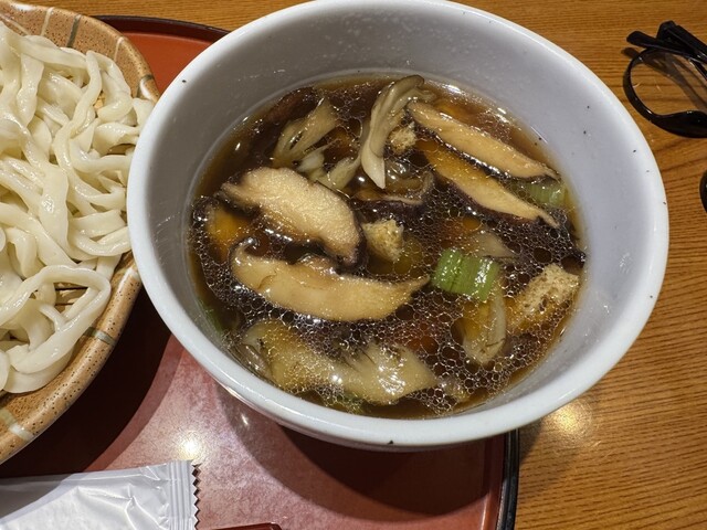 つけ汁は濃いめの北関東の限りなく黒に近い汁.そこにきのこやネギ,油揚げなどが入っています.うどんはやや平たい...