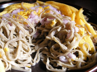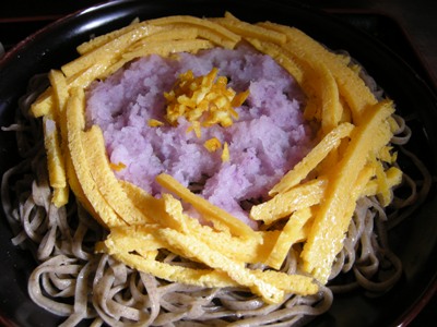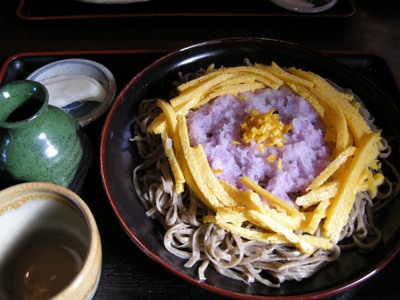 「昭陽おろしそば」は「特製9割そば」ほど黒くなくて、太さも普通。蕎麦の上に紫色の辛味大根がたっぷりかかり、その周囲に厚めに切った錦糸玉子が囲むようにのっていました。なんとこの錦糸玉子、甘い玉子焼きなんです。辛味大根の辛味と甘い玉子焼きのコントラストを楽しむ御蕎麦なのだとか。楽しいです。そして美味しかったです。