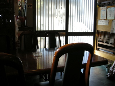 「栃木そば探訪」の本を見て訪ねてみました。駐車場は店舗から10メートルぐらい離れた通り(宇都宮・烏山線)に面して4台分ぐらいありました。民家の一角と思われる店の戸をガラガラと開けると正面に4人がけテーブルが縦に3列。ただし一番奥、厨房前のテーブルは家人専用になっているようで、タバコと灰皿、孫の手などが置いてありました。左側には小上がりになったテーブルが2つほど、2人席と思われるテーブル席が1~2個あるようでした。