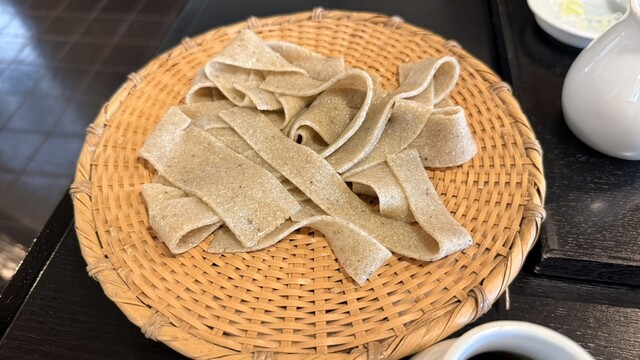 主に栃木県内産の玄ソバを直接生産者より仕入れ、低温貯蔵庫で温度管理のもと玄ソバを石臼で挽いた粗挽き蕎麦粉をつなぎ等は一切使用せず水だけで打ち上げた十割蕎麦。