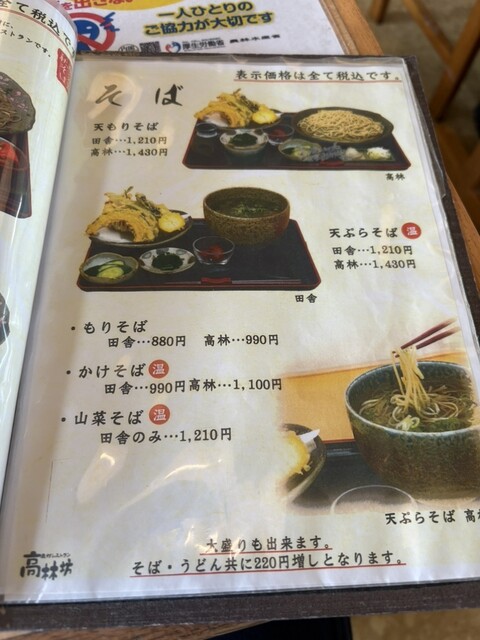 天もりそば、もりそば、かけそば、山菜そば、天ぷらそば。