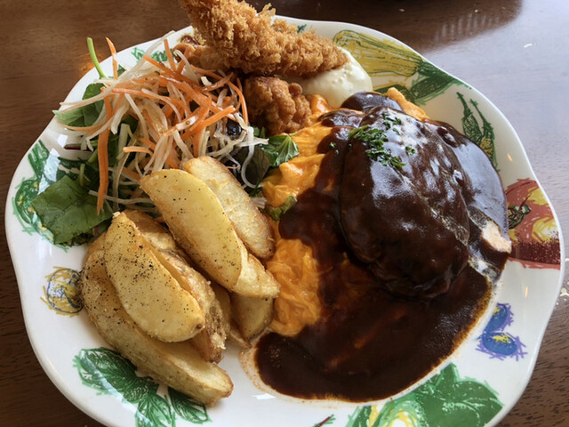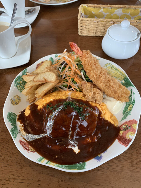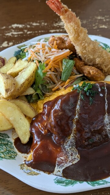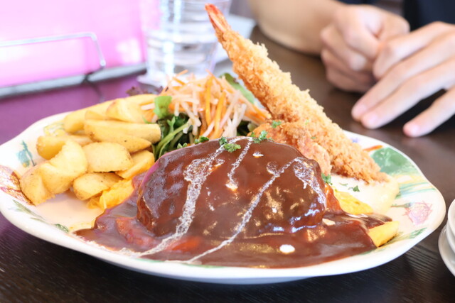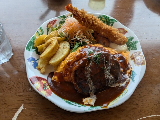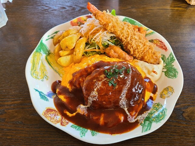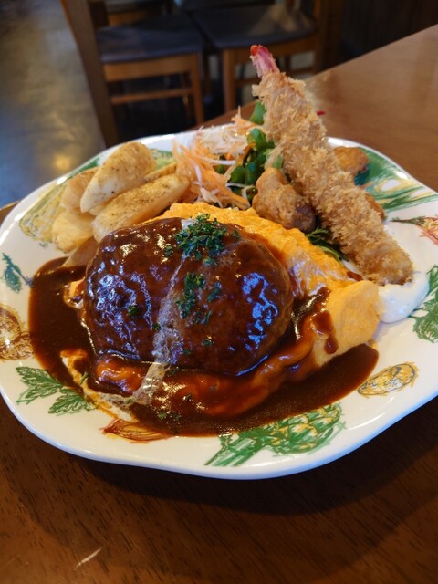 オムライスにハンバーグやエビフライがついていてボリューミー。
