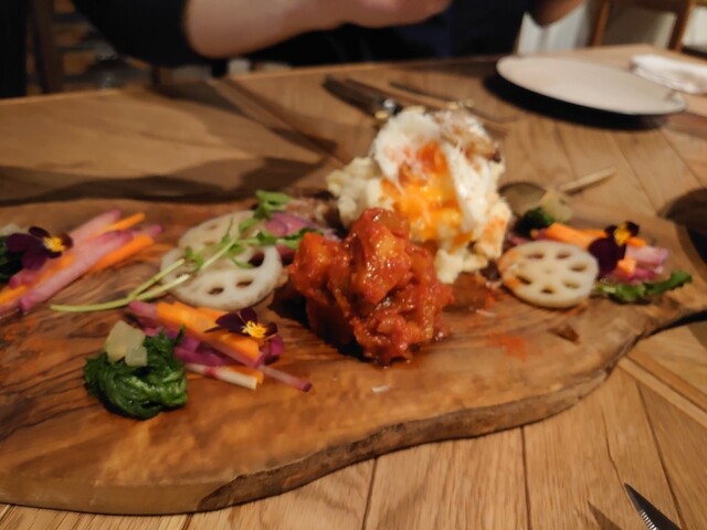 お昼のセットメニューを3種類いただきました。1.那須鶏の唐揚げ定食、2.チキン南蛮定食、3.油淋鶏定食、いずれも鶏肉を揚げたメニューでしたが、3は揚げ方が浅くて衣が厚いのですがカリっとせずに柔らかい、1は逆に揚げすぎでガリガリ、と、調理がちょっと安定しない感じがありました。ただ、地元野菜のサラダや小鉢など、バラン...