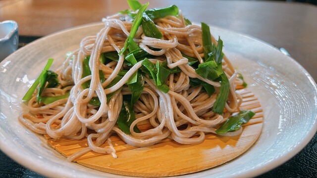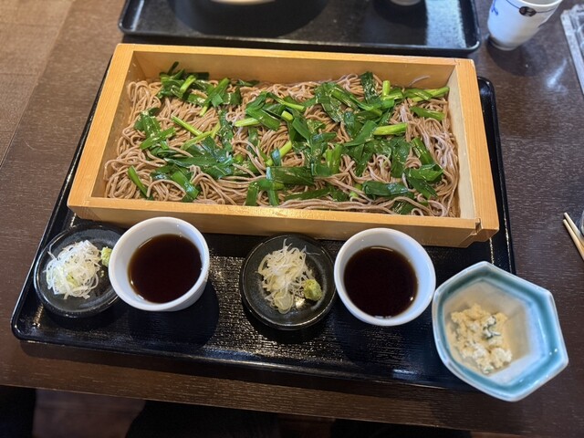 にら蕎麦二合盛は板そばスタイルに盛られたそばの上に、生のゆでたニラが散らされているタイプ。意外なルックスに虚を突...