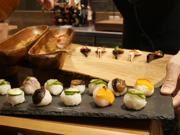 野菜寿司や厚揚げのグリエ、トマトのスープ鍋、さつまいものスープ、魚介のピラフ、