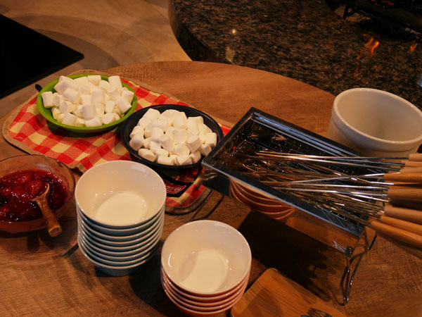 暖炉の周辺に焼きマシュマロのための材料が置かれ、自由に参加します。