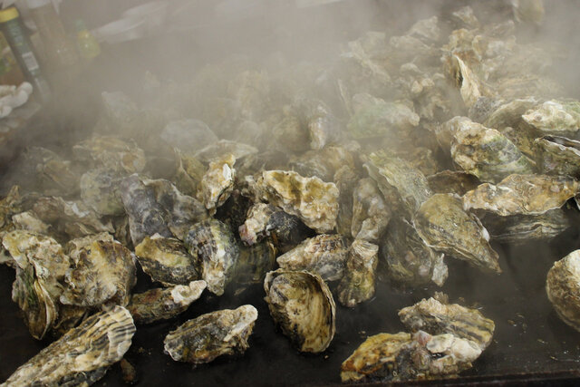豪快に鉄板で熱された牡蠣が大量に提供されます。殻を剥く作業も楽しい。味変用の調味料は持ち込んで...