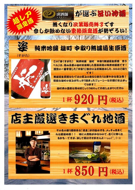 当店は地産地消に拘り、徳島の食材と利酒師でもある私が厳選した地酒をより多くのお客様に味わって頂き、お客様のニーズに即対応出来るような経営体制で『地元食材』と『地酒』と『昭和の雰囲気』に拘り続けている昭和チックな居酒屋です。 ~御予約を御検討頂いているお客様へ~ 当店は『食堂』や『喫茶店』ではなく『酒と食材に拘った個人経営の居酒屋』ですので店舗形態を御理解頂いた上で御予約下さい。