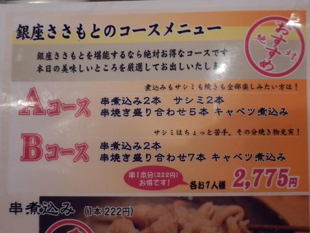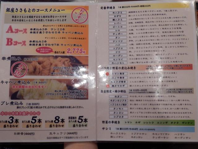 予約可 ネット予約可能。お店のHP、もしくはGoogleの「銀座ささもと」で予約出来ます。予約の場合はコース料理(串煮込み2本、串焼き5本、キャベツ煮込み )を人数分ご注文していただきます。その後の追加は可能です。 |