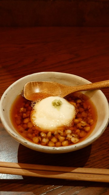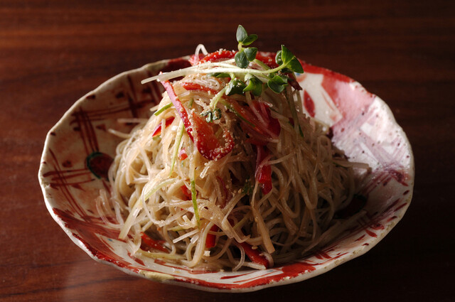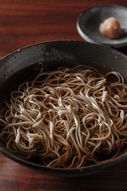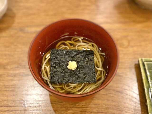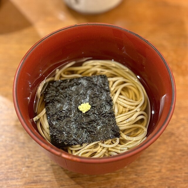 銀座の路地裏にて、個室もあり静かにゆったりと。店内はテーブル16席、大小の個室が2つ、白木のカウンター6席。歌舞伎や映画の後でも、落ち着いて楽しめます。名物「ひやかけそば」は冷たいつゆを「ぶっかけ」たもの。お客様やマスコミ各社から「味は流石に極まれり」と高いご評価を頂戴しており、薄味のつゆは最後の一滴まで飲み干せます。他にも一品料理、お任せコース、日本酒やシャンパン、ワインなども各種ございます。