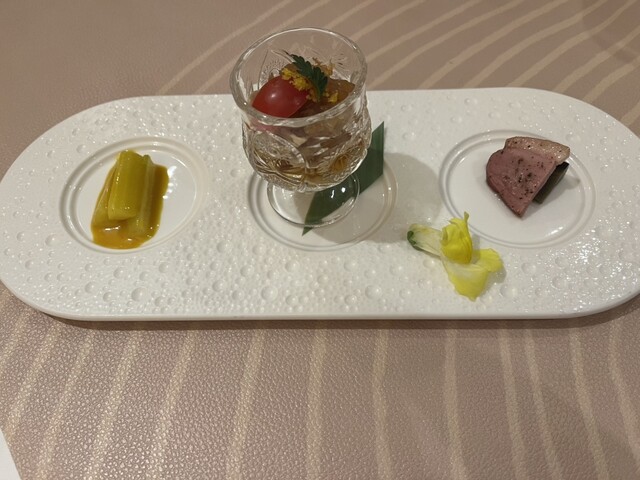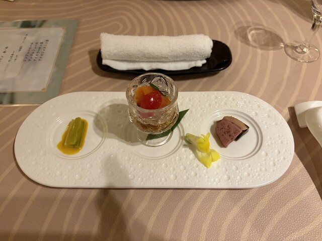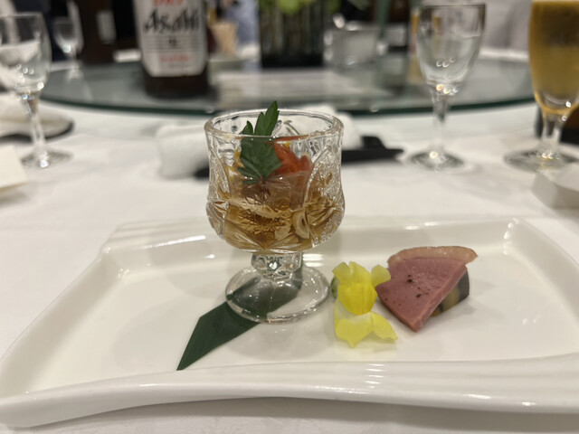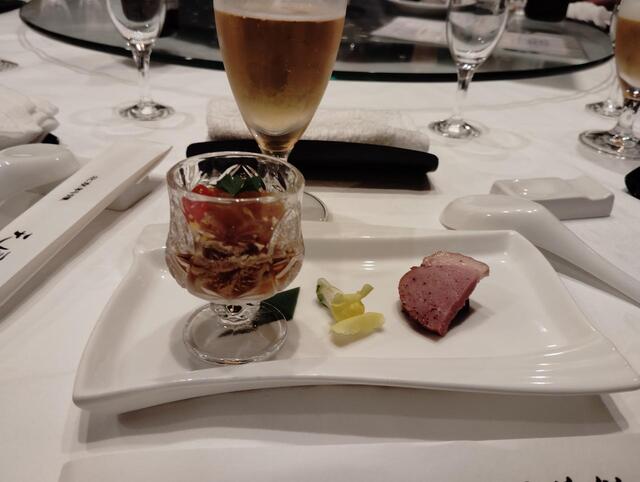 コースで、前菜の赤海老の老酒漬けは非常に味がよいです。