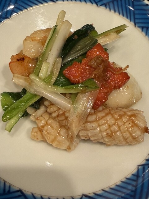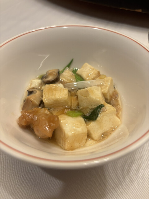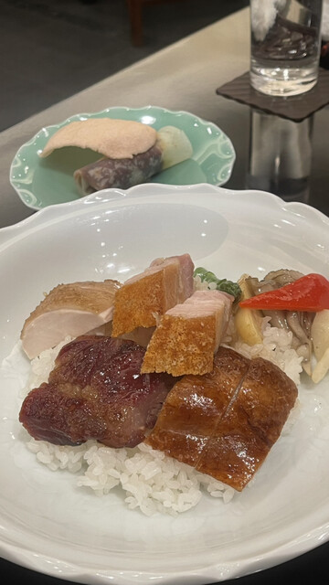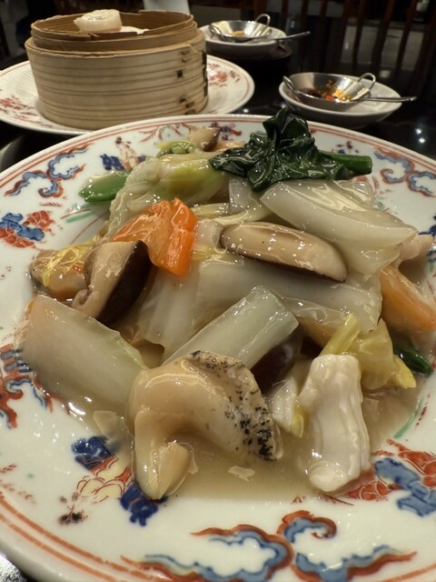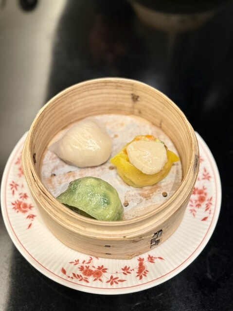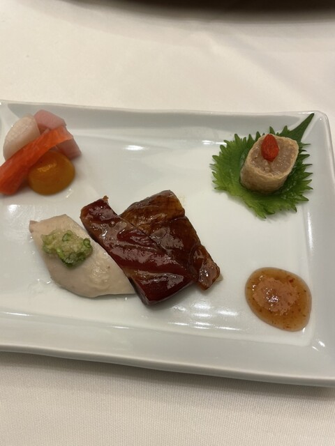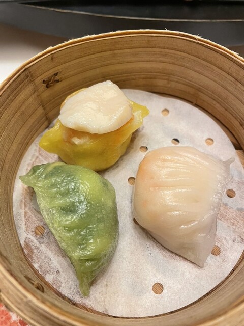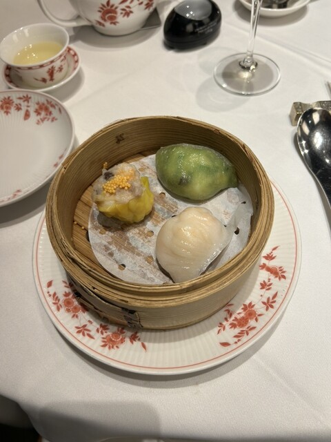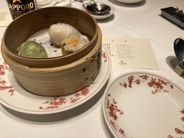 忘年会で嘉祥コース(¥15,000)を頂きました。品の良い前菜の後に出てきた点心は、それぞれ肉、帆立を前面に出した海鮮の旨みが濃縮した餡が、過剰なモッチリ感にならない皮に包まれて何とも素敵な美味しさ。...