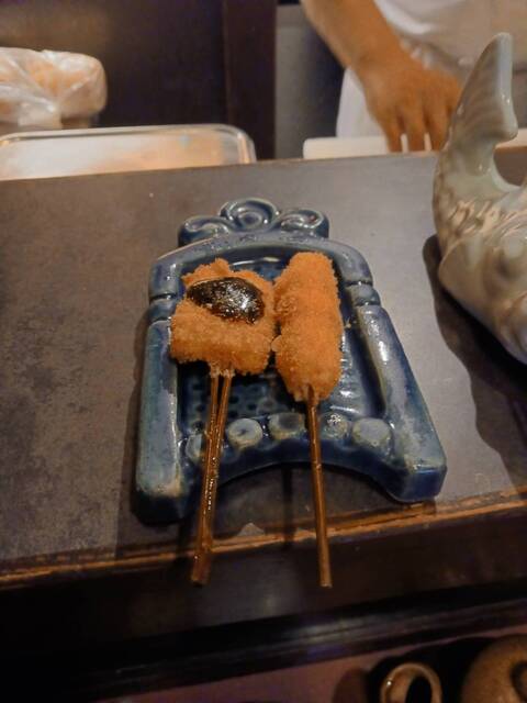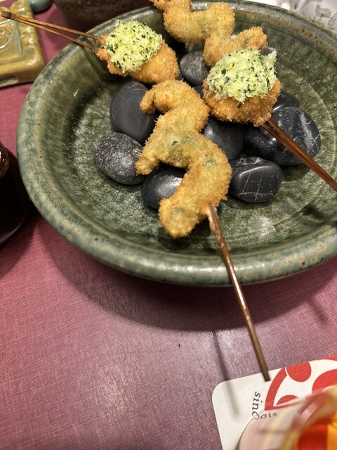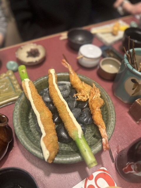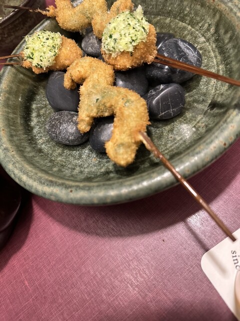 平日ランチで13時頃訪問。 並ぶ用の椅子がたくさんあったので、お昼時だし並ぶかな?と思いましたがすぐに入れました! ■注文したもの 丁字(ちょうじ)串 1,500円 はじめにキャベツと、 串揚げ8本(海老・アスパラガス他6本) 生野菜・ご飯・赤だし・香物・シャーベットまで付い... 詳細を見る
