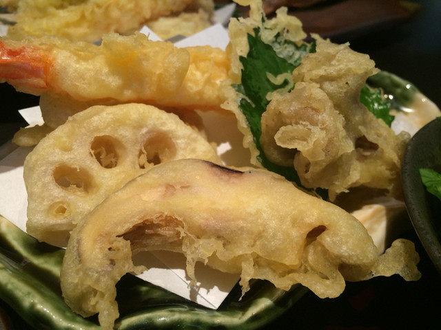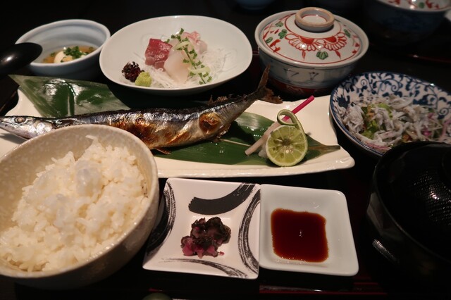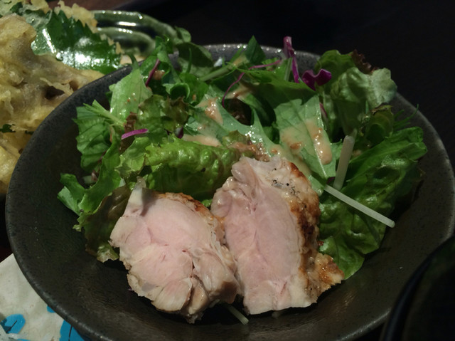 湯豆腐、天ぷらに、サラダ、焼魚、お刺身、お味噌汁、お新香がついてボリュームは満点。