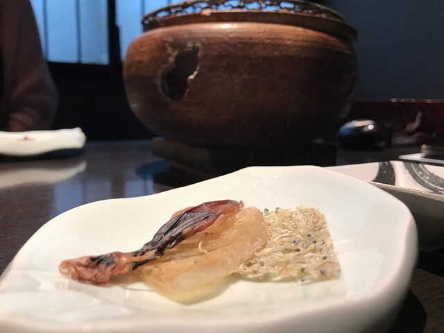お通しはホタルイカ、たたみいわし、エイヒレを炭の鉢で炙っていただきます。