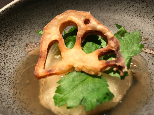 もっちもちのまんじゅうは、お出汁の味付けが絶妙でわさびと三つ葉の香りがとってもよく合いますね。