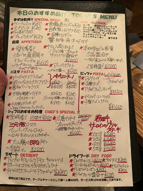テーブルチャージ お1人様¥400 サービス料10%頂戴致します。【飲み放題プラン利用時はテーブルチャージ、サービス料は発生致しません】追加オーダーはサービス料10% |