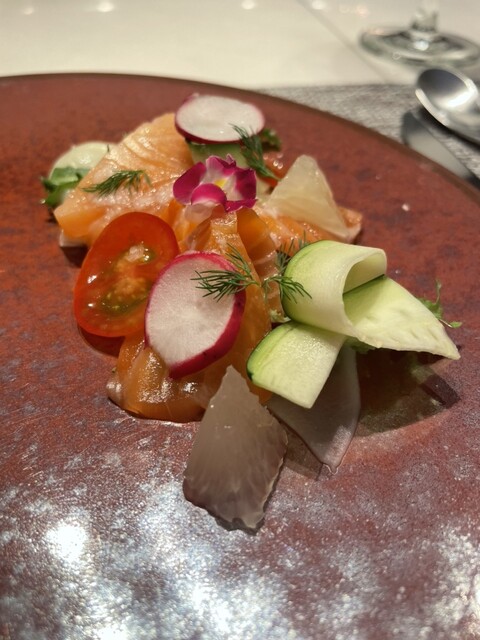 スターターには、真鯛の昆布マリネとナスを選択。透明感のある真鯛はしっとりとした食感で、ほどよく香る昆布の風味がやさしく広がります。みずみずしいスプラウトとまろやかな白いソ...