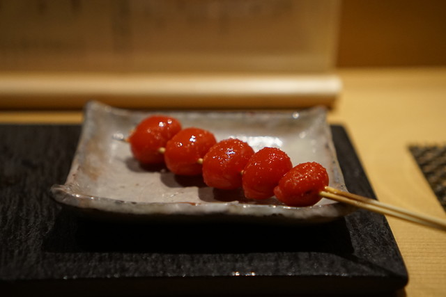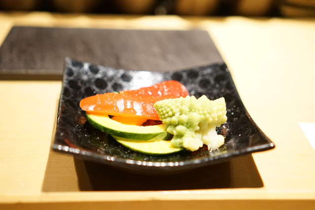 野菜盛り合わせから始まって串焼き、途中に箸休めの大根のゆかり添えという流れで...