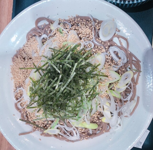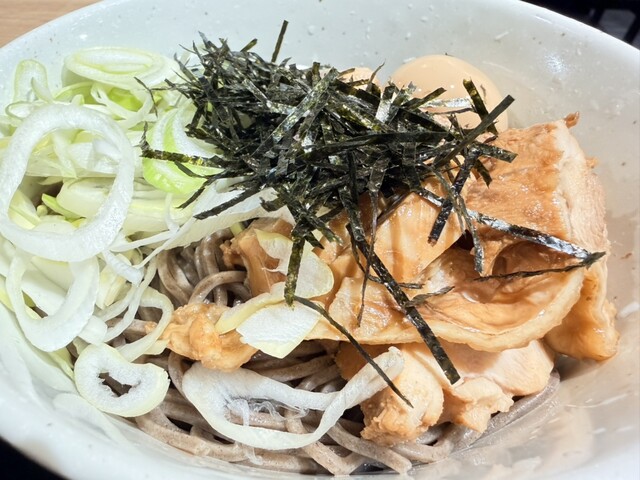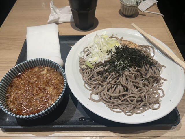 ラー油の効いたピリ辛のお出汁に、噛み応えのあるそばをボリュームたっぷりに提供
