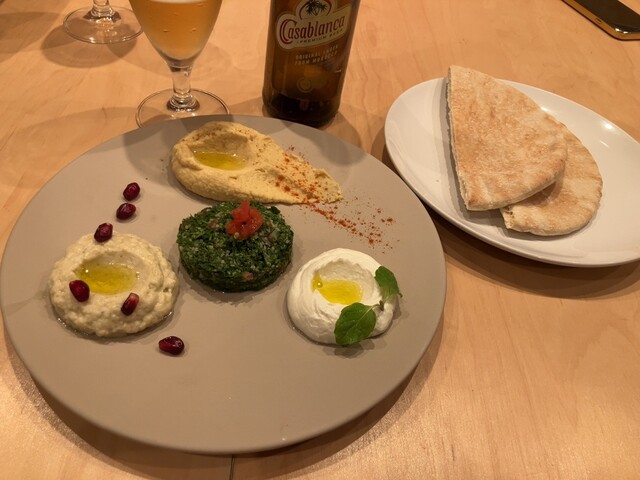 週末19:30頃訪問です。ビルの二階のこじんまりとした、ワンオペのお店です。先客はグループ1組とカウンター席にお二人様1組。席に座りメニューを見ると中東料理がたくさん並んでいます。説明はあるものの悩みます。悩んでいると店員さんにオススメコースをリコメンドされ、それにしてみました。8割のお客さんが頼むらしいので期待です。