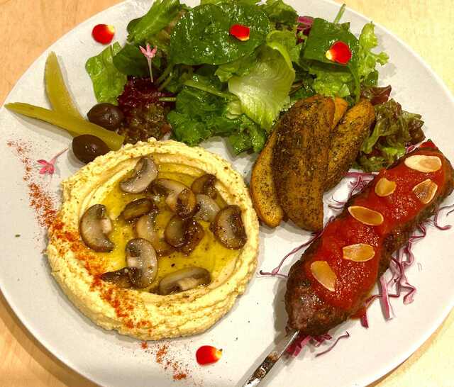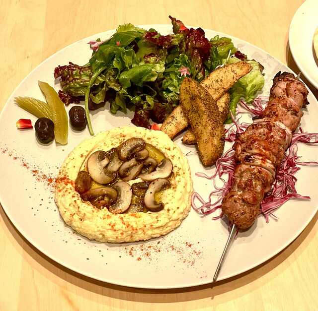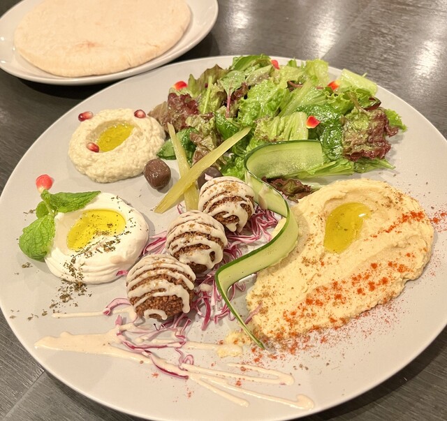週末19:30頃訪問です。ビルの二階のこじんまりとした、ワンオペのお店です。先客はグループ1組とカウンター席にお二人様1組。席に座りメニューを見ると中東料理がたくさん並んでいます。... 詳細を見る