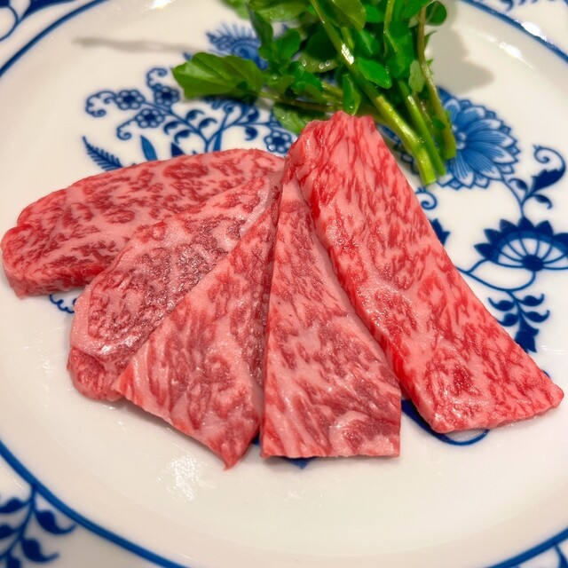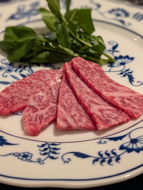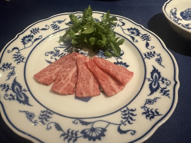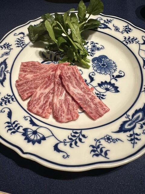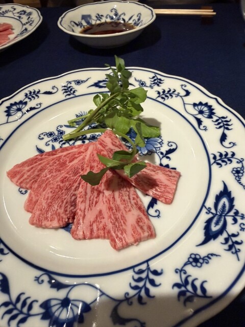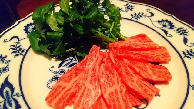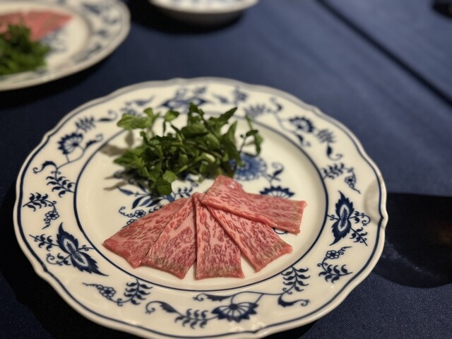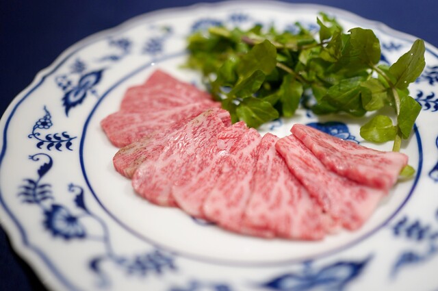丁寧に薄切りされた和牛と