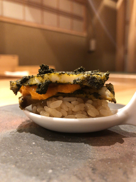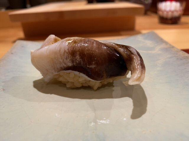 ◯厚めに切り出した鮑を捻ることでコンパクトに握りとして見事に完成させ、アワビの肝ソースと雲丹を乗せて頂く、かなりの濃厚ネタ