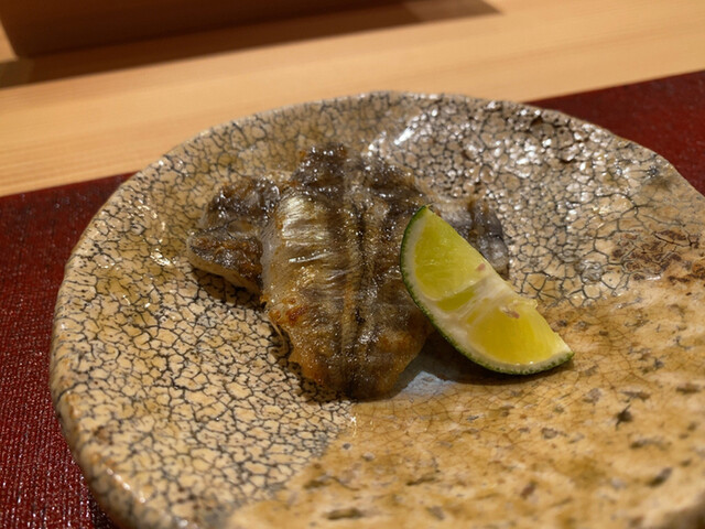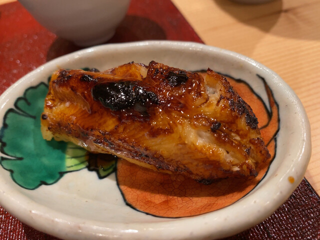 ◯焼肉・・・剥がしの名残りとかであろうか、マグロの切れ端を焼肉のように焼いたものと生のトロとを一緒に巻いた焼き物をお決まりでいただく。ここまで辿り着くにはそれなりの胃力が必要なので、少食目な方はお摘みの量を少なめにしたり握りの舎利を小さめにするようにお願いすると良い(2022年秋の時点ではやってらっしゃいません)
