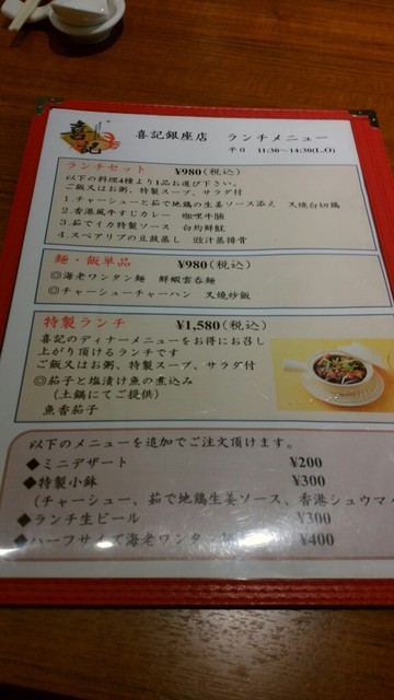 香港で人気のスパイシー料理「喜記(へいげい)」の日本初の支店が銀座に出来て開店一周年。それを記念して特別メニューを作った、という案内が届いた。