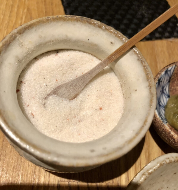 白濁スープは、元々が薄味なので、はじめから自家製塩をかけて食べることを推奨される。