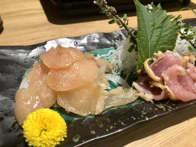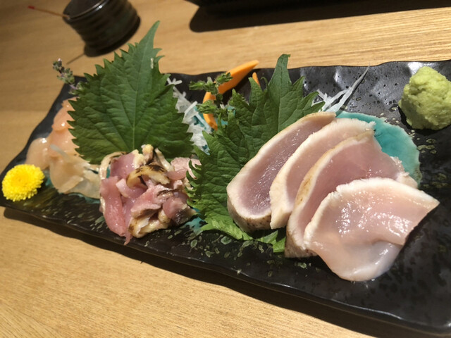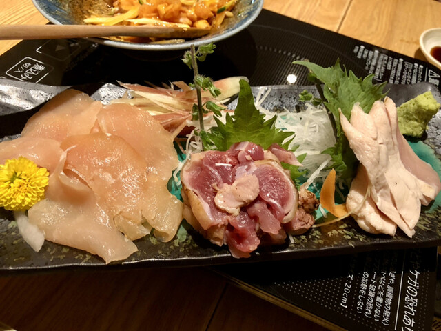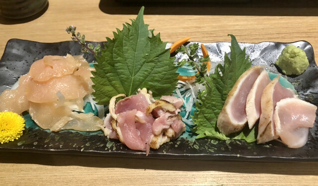 ・鶏肉三昧~鶏生ハム・ももたたき・とりわさ三種の盛り合わせ~(¥1,600円)