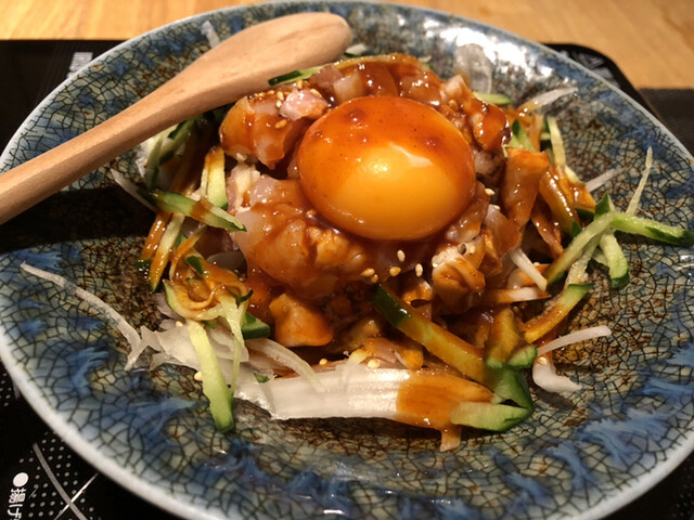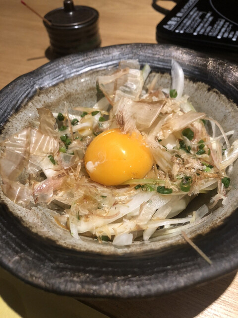 「玉ねぎ、みょうがに卵黄をのせ、自家製ポン酢をたっぷりかけております」とのこと。